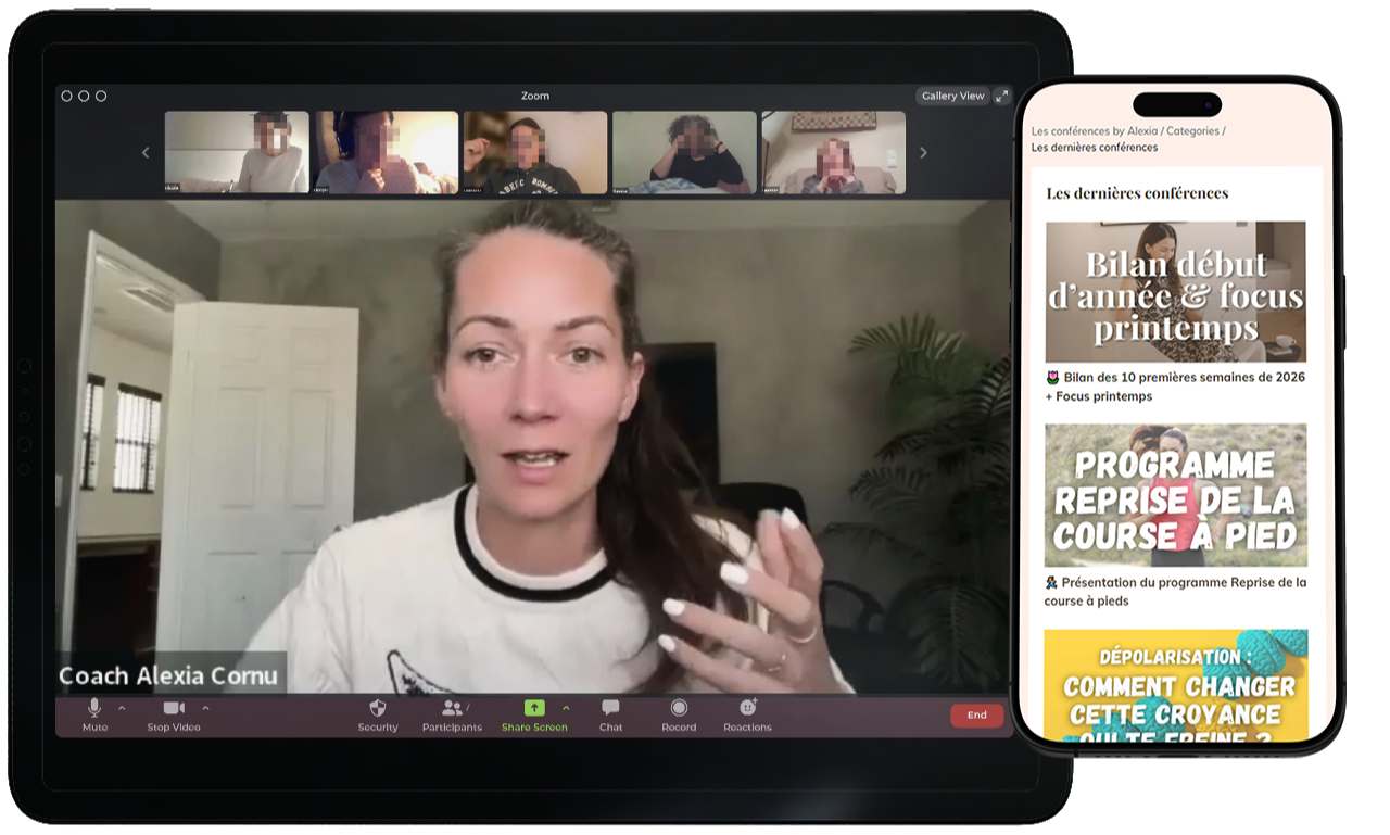 Chaque mercredi à 20h30 : un coaching, un atelier ou une conférence avec Alexia ou des expertes invitées (sommeil, équilibre hormonal, perte de poids, nutrition, émotions, organisation…).