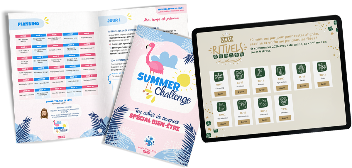 En août avec ton cahier de vacances et en décembre avec ton calendrier de l'avent digital : 30 jours et 10 minutes par jour, pour prendre soin de toi avec des minis challenges et rituels.